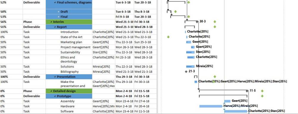 • 2018-04-14 Upload the Interim Report and Presentation to the wiki. The report must contain the Introduction, including the tasks, team members allocation and Gantt chart, State of the Art, Marketing Plan, Project Management, Eco-eficiency Measures for Sustainability, Ethical and Deontological Concerns, Proposed Solution and Bibliography chapters